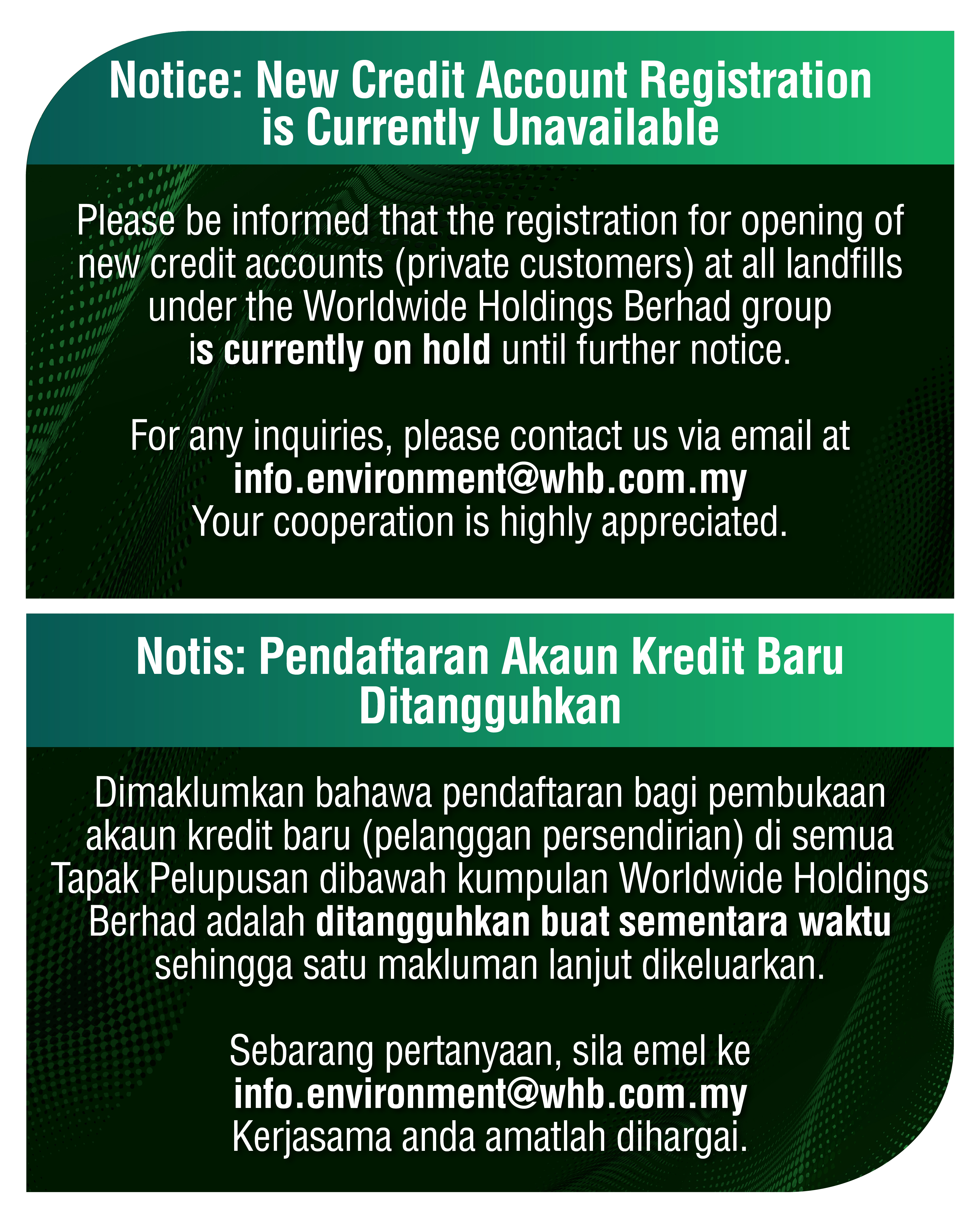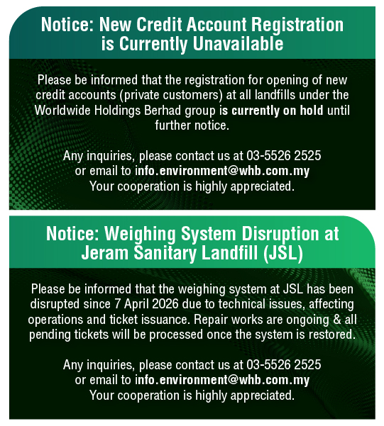 Versi Bahasa Melayu Pada 6 Disember 2023, Majlis Mesyuarat Kerajaan Negeri (MMKN) Selangor Ke-30/2023, yang telah disahkan oleh MMKN Ke-31/2023 pada 13 Disember 2023, telah memutuskan untuk melanjutkan kontrak perkhidmatan kerja-kerja penyelenggaraan pasca penutupan di beberapa tapak pelupusan utama di Selangor. Worldwide Holdings Berhad telah diberi kelulusan untuk menyambung kontrak penyelenggaraan pasca penutupan di Tapak